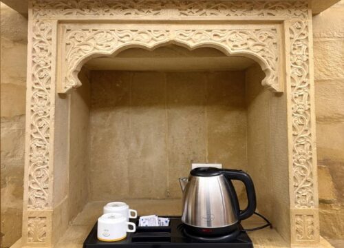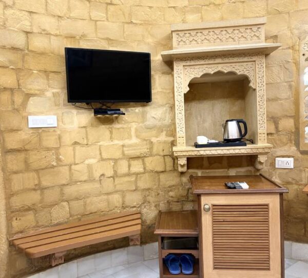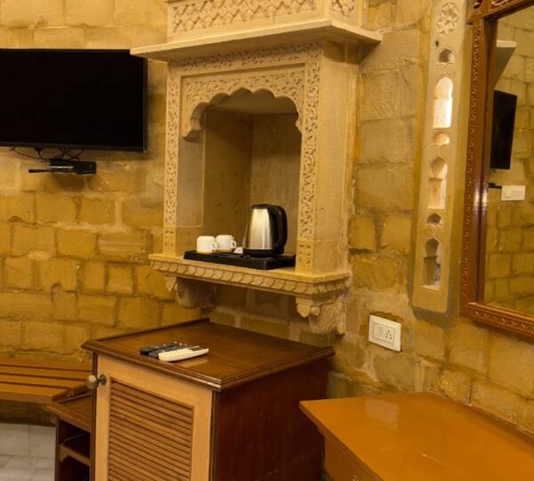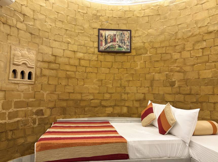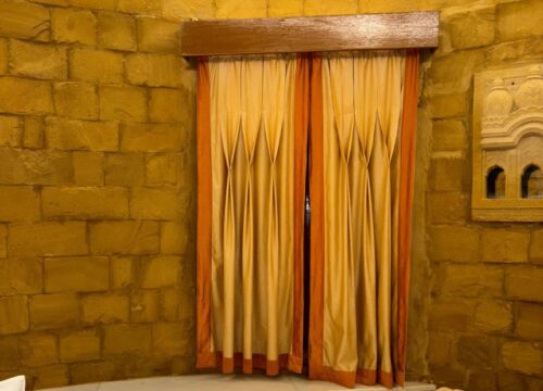Wake up to breathtaking views of the majestic Jaisalmer Fort from our Burj Fort View Room. Designed in authentic Rajasthani style, the room features elegant interiors, traditional stone architecture, and handcrafted furnishings. Enjoy modern comforts such as air-conditioning, Wi-Fi, and a well-appointed ensuite bathroom. The room’s large windows capture the golden glow of the fort at sunrise and sunset, creating a truly magical ambiance. Perfect for guests seeking a royal experience with a touch of heritage charm and scenic beauty.